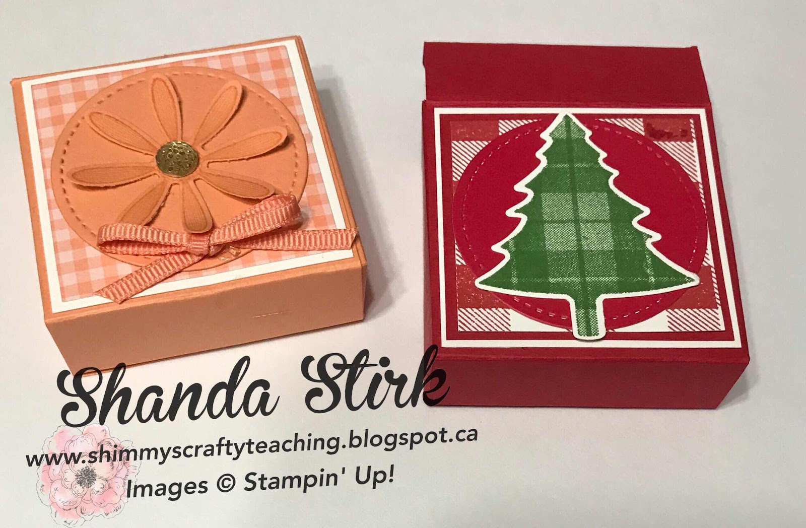 The little box on the left was designed by Erica Cerwin for our team meeting for July. It was so cute and I was working with a new Christmas stamp set called Perfectly Plaid so I made another box to match a card I made for a class.