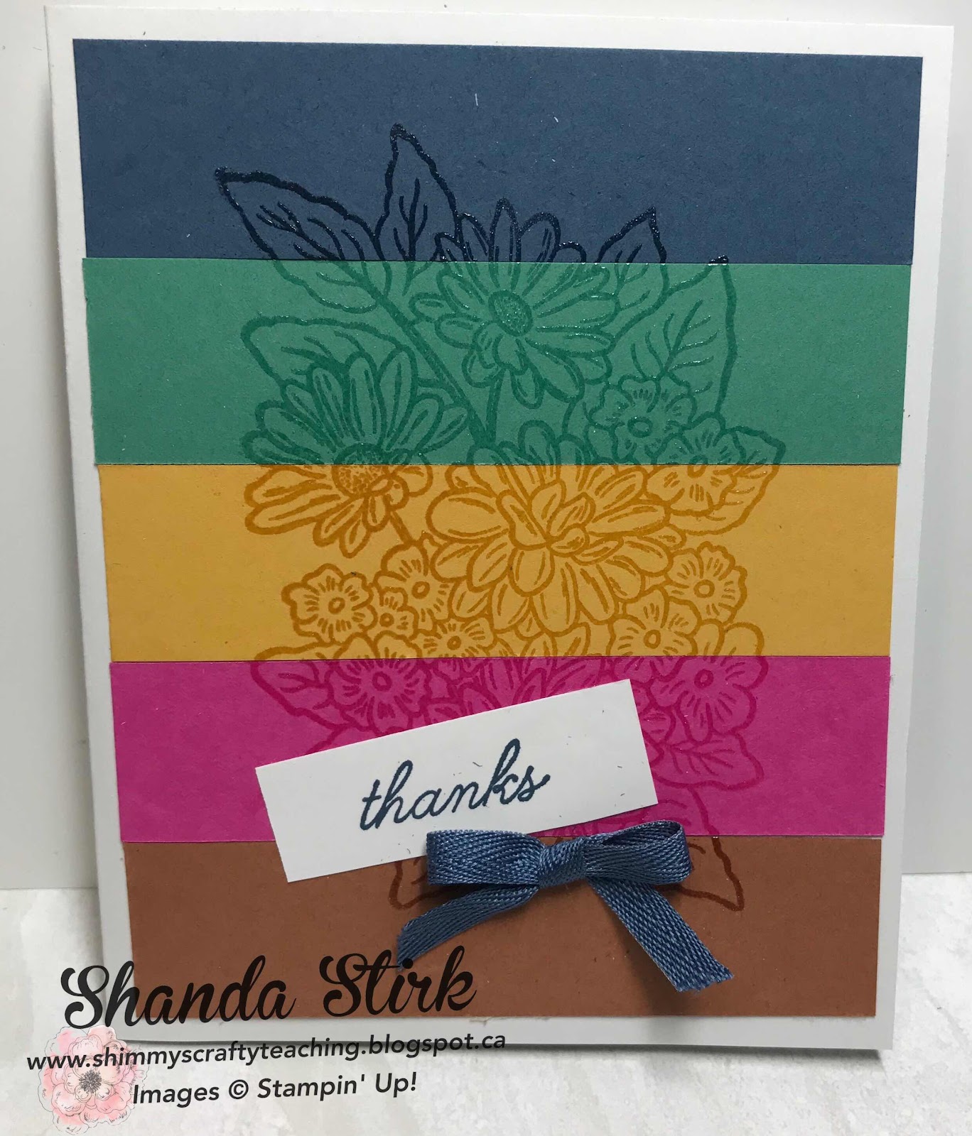 The new In Colour inks are not yet available and I wanted to show off the new colours so I cut 1” x 4” pieces and put them on my card. I stamped the image from Ornate Style with Versemark and then embossed it with clear embossing powder and you can really see all the colours.